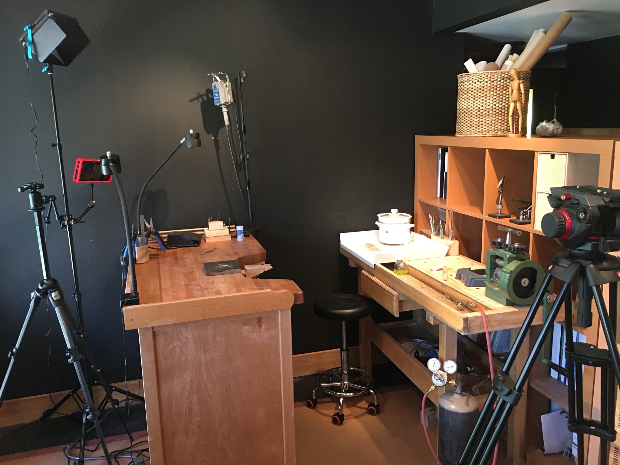 The great thing about using a tool like Sketchup is you can move a virtual bookshelf or jeweler's bench much easier than physical ones. I also experimented with virtual camera positions in 3D space. After playing around with different configurations in 3D, I started moving the physical things into place. I also started digging around for what I had for lights and cameras that might capture the silversmithing "kitchen".